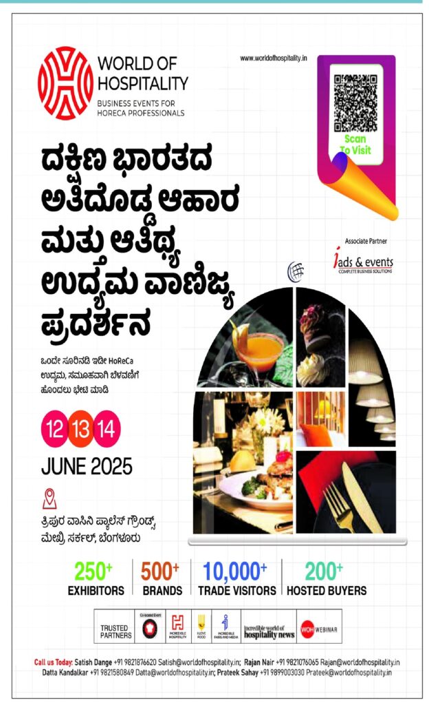 ಬೆಂಗಳೂರು: ʼವರ್ಲ್ಡ್ ಆಫ್ ಹಾಸ್ಪಿಟಾಲಿಟಿʼ ಆಯೋಜಿಸಿರುವ ದಕ್ಷಿಣ ಭಾರತದ ಅತಿ ದೊಡ್ಡ ಆಹಾರ ಮತ್ತು ಆತಿಥ್ಯ ಉದ್ಯಮದ ವಾಣಿಜ್ಯ ಪ್ರದರ್ಶನ ಬೆಂಗಳೂರು ಅರಮನೆ ಮೈದಾನದಲ್ಲಿ ನಡೆಯುತ್ತಿದೆ. ಅರಮನೆ ಮೈದಾನದ ತ್ರಿಪುರ ವಾಸಿನಿಯಲ್ಲಿ ಇಂದು ಆರಂಭವಾಗಿರುವ ಬೃಹತ್ ಪ್ರದರ್ಶನ ನಾಳೆ (ಜೂ.13) ಮತ್ತು ನಾಡಿದ್ದು (ಜೂ.14) ಕೂಡ ಇರಲಿದೆ.