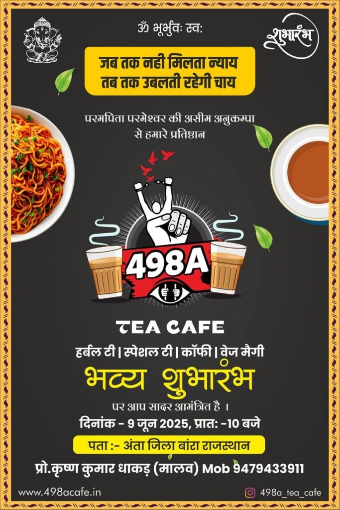 ರಾಜಸ್ಥಾನದ ಬಾರಾನ್ ಜಿಲ್ಲೆಯ ಅಂತಾ ಕಸ್ಬಾದಲ್ಲಿ ಕೃಷ್ಣಕುಮಾರ್ ಧಾಕಡ್ ಎಂಬವರು ತಮ್ಮ ಪತ್ನಿಯಿಂದ ದಾಖಲಿಸಲಾದ ಕೌಟುಂಬಿಕ ಹಿಂಸೆ ಮತ್ತು ಒತ್ತಡದ ಆರೋಪಗಳ ವಿರುದ್ಧ ಈ  ರೀತಿಯಲ್ಲಿ ಪ್ರತಿಭಟನೆ ನಡೆಸುತ್ತಿದ್ದಾರೆ. ಯುಪಿಎಸ್‌ಸಿ ಪರೀಕ್ಷೆಗೆ ತಯಾರಿ ನಡೆಸುತ್ತಿದ್ದ ಕೃಷ್ಣಕುಮಾರ್, ತನ್ನ ಮೇಲೆ ಮಾಡಲಾದ ತಪ್ಪು ಆರೋಪಗಳಿಂದ ಬೇಸತ್ತು, “498ಎ ಟೀ ಕೆಫೆ” ಎಂಬ ಹೆಸರಿನ ಚಹಾ ಅಂಗಡಿಯನ್ನು ತಮ್ಮ ಪತ್ನಿಯ ಮನೆ ಬಳಿಯೇ ತೆರೆದಿದ್ದಾರೆ. ಭಾರತೀಯ ದಂಡ ಸಂಹಿತೆಯ (IPC) ಸೆಕ್ಷನ್ 498ಎ ಅಡಿ ದಾಖಲಾದ ದೌರ್ಜನ್ಯ ಕೇಸ್‌ನ ವಿರುದ್ಧ ಈ ಮೂಲಕ ಪ್ರತಿಭಟನೆ ಆರಂಭಿಸಿದ್ದಾರೆ.